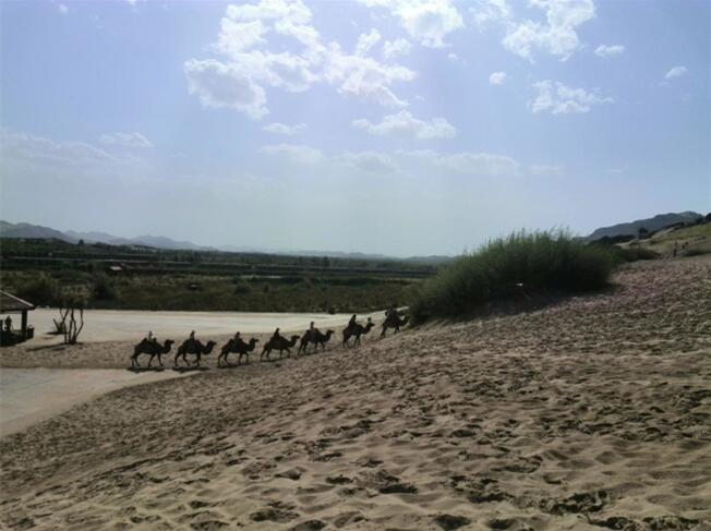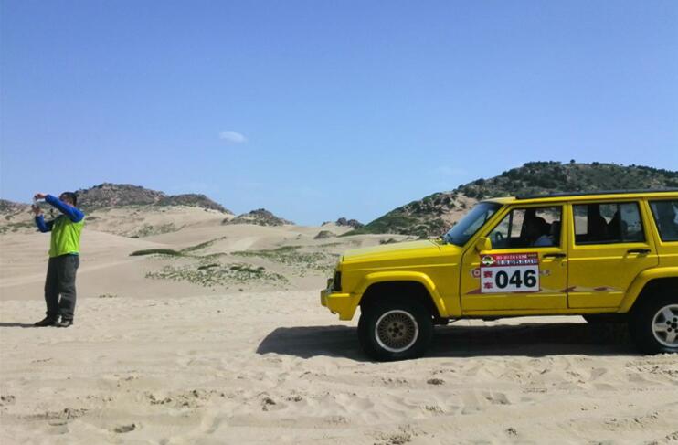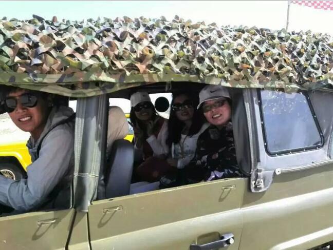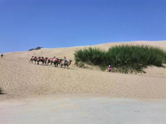 車子駛進(jìn)玉龍沙湖的停車場,我的思緒由漫漫歷史回到眼前景色。小小的一個湖,大大的看不到邊際的沙漠。據(jù)說這就是歷史上有名的科爾沁草原,現(xiàn)在也只能叫科爾沁沙地了吧。湖水的面積越來越小,湖水周圍一片小小的綠洲,綠洲外圍就是望不到邊際的沙漠。在我們出行前,旅行社的對這里的描繪是這個樣子:“讓您感受茫茫大漠、沙丘滾滾,連綿起伏的雄渾與壯美,金黃色的沙坡掩映在藍(lán)天、白云下,有一種茫茫沙海入云天的壯麗景象。觀賞陰石、陽石、石長城等沙漠奇觀,體驗夢幻沙漠所帶來的無限驚奇!边@里說說的我的實際感受:沙子很白很細(xì),光著腳踩上去很燙,爬到沙坡上面,我的腳已被燙的發(fā)紅。站在沙坡上面遠(yuǎn)望,沙丘滾滾,連綿起伏是真實場景,但是我卻不能和雄渾、壯美等詞匯聯(lián)系在一起,也許是受后邊幾日景色的干擾,也許是在港城海邊也有很多沙地的原因,沙地并不算這幾天旅行中的美景。在玉龍沙湖的游覽中有兩點最記憶猶新:越野車和兩部電影的外景地。這里有兩個自費(fèi)項目,越野車和騎駱駝,我選擇了越野車。交了錢分了組后,我和馬姐、小費(fèi)、小霍四人一車,聽導(dǎo)游說越野車很怕人,那三人就一下做到了后排,我只好做到副駕駛位置。記好安全帶后,司機(jī)帶我們沖進(jìn)沙漠深處,一開始道路還算平緩,我們的心也是平緩的,坡度逐漸陡峭起來,后排三位的叫聲也越發(fā)尖銳,突然一個幾乎90度的坡沖下,車子似乎好像失去了重力,直接下去了,后排三位女士的聲音已經(jīng)不只尖銳了,近乎聲嘶力竭,我坐在前排,可能是能看到下邊的原因,并沒有覺得如此可怕,只是覺得很爽。越野車就這樣起起伏伏的狂奔了20分鐘又回到了遠(yuǎn)點,驚險刺激,對的起120元的價位。這里是電影《萬物生長》和《后會無期》的外景地,《萬物生長》中范冰冰和韓庚的激情戲就是在這片沙子中拍攝的,就沖這個我也要光腳在沙堆上走一走;據(jù)劉繼偉說他看到了《后會無期》中的那顆衛(wèi)星,我卻已經(jīng)走累了,不去再看那顆衛(wèi)星了和大伙坐在山地旁邊的亭子里休息,順便看看別人騎駱駝。不到4點的功夫我們都已經(jīng)從景區(qū)出來了,坐車去往翁牛特旗的旗政府烏丹吃飯休息。